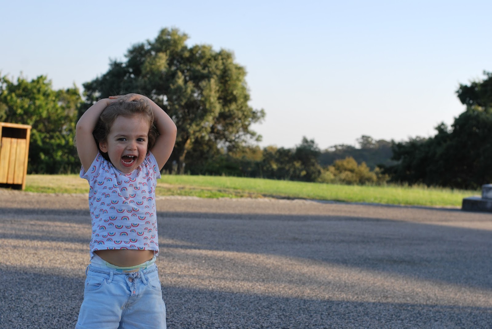 Quando tinha uns 14 anos e a minha mãe me ofereceu uns calções da Agatha Ruiz de la Prada, todos coloridos, tive um ataque de nervos. No meio da parvoíce da idade do armário e dos complexos, senti aquilo como um afronta. Chorei, berrei e - agora dá-me para rir, claro - chamei à minha mãe "assassina" (a lógica devia ser "queres que me mate?"). Descontroladíssima, claro, estão a ver o nível de falta de amor próprio que para ali ia. Foi uma vitória começar a vestir calções curtos, saias, vestidos que deixassem ver os joelhos e a coxa. Uma vitória ainda maior seria deixar mesmo de me importar com, mas duvido que consiga. Até lá, vou gozando o facto de não ter vergonha, de não querer saber, de me sentir confortável com roupas curtas no verão. Who cares? "Dar importância ou que a tem, Joana", converso muitas vezes comigo, para me convencer. E foi com umas jardineiras muita' giras que fomos até ao Jardim da Liberdade, em Santarém, para a Isabel se divertir. O resto... o resto são só uns joelhos.